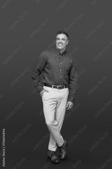 Confident happy elegant middle aged business man entrepreneur, smiling older professional stylish businessman wearing green shirt looking at camera standing isolated on gray, full length vertical.