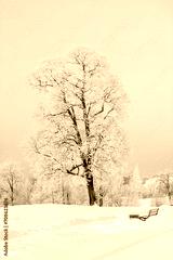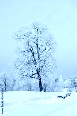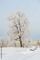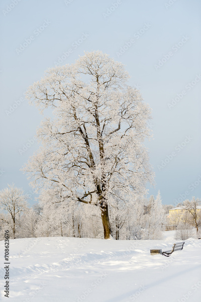 Sunny winter day in the park and trees in the snow close-up. Winter nature.