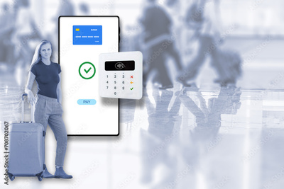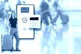 Attractive young female tourist is standing with suitcase next to a magnified smartphone and payment terminal. Blurred passengers at the airport are in the background.