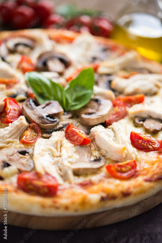 Pizza with chicken, tomato and mushrooms close up
