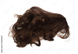 Wind blow Long wavy curl Wig hair style fly fall. Brown woman wig hair float in mid air. Curly wavy brown wig hair wind blow cloud throw. White background isolated detail motion