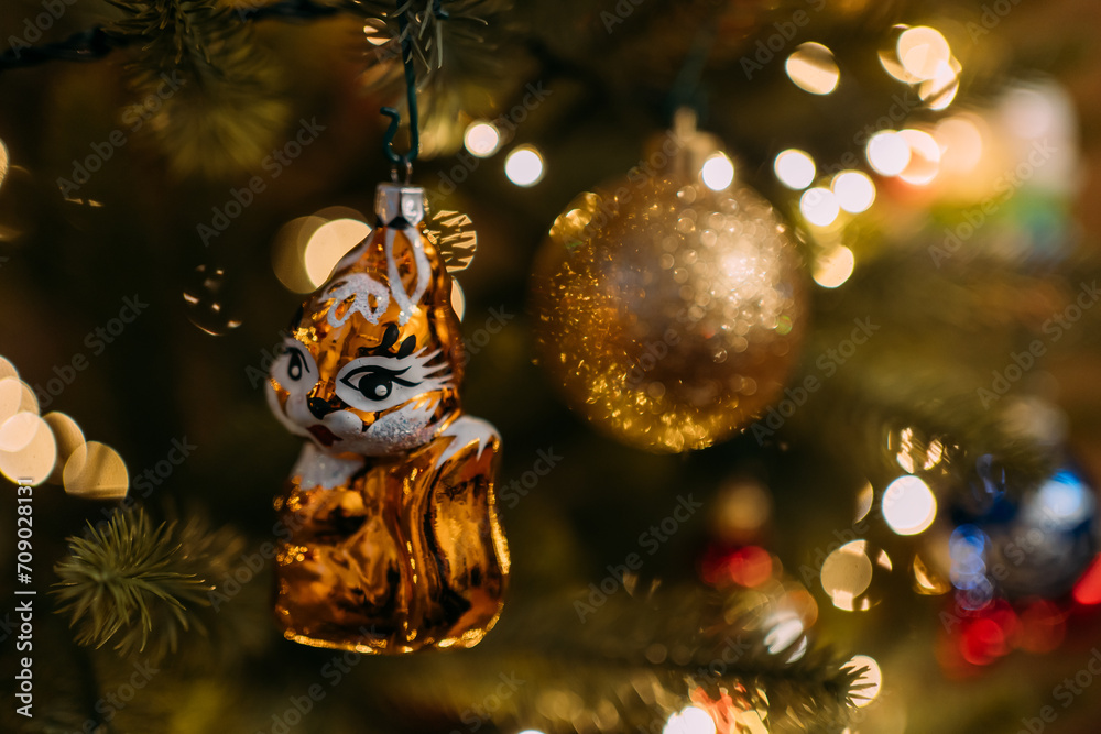 A New Year's glass toy in the form of a squirrel figurine on an artificial Christmas tree among the warm yellow lights of a garland. Christmas tree decoration on the eve of the New Year