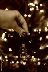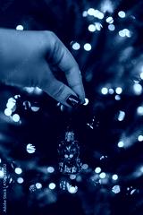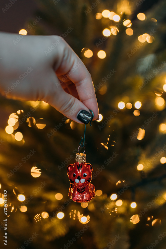 A New Year's glass toy in the shape of a tiger in the girl's hand on the background of an artificial Christmas tree with a garland with warm blurred lights. The symbol of the year is a tiger
