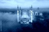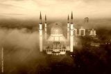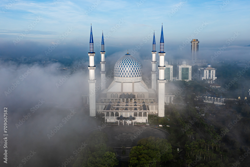 Aerial view the blue mosque of Shah Alam during early morning in low clouds with blue sky