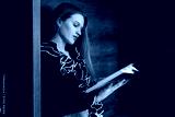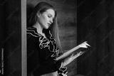 A red-haired lonely girl with long hair and a black blouse reads a book in the fantasy genre in a quiet place in the library
