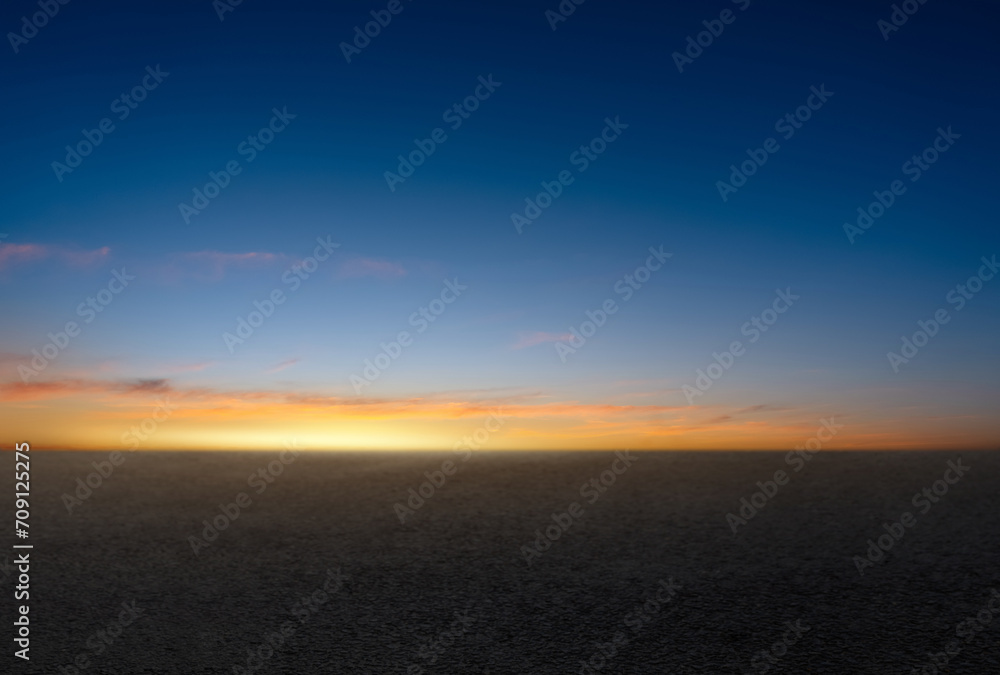 Sunset Sky,Cloud Background,Horizon Evening Summer twilight dusk sky with gloomy vivid blue, yellow, orange with sunlight reflecting on dark concrete floor texture or rough asphalt street pavement