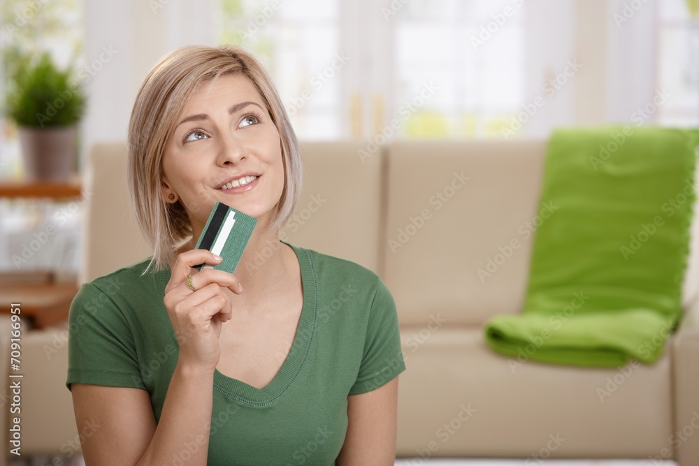 Woman holding credit card dreaming about shopping at home.