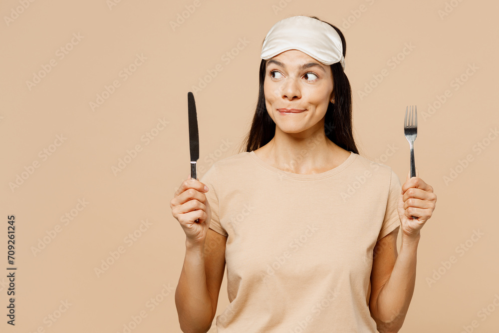 Young hungry Latin woman she wears pyjamas jam sleep eye mask rest relax at home hold fork spoon look aside on area isolated on plain pastel light beige background studio. Good mood night nap concept.