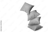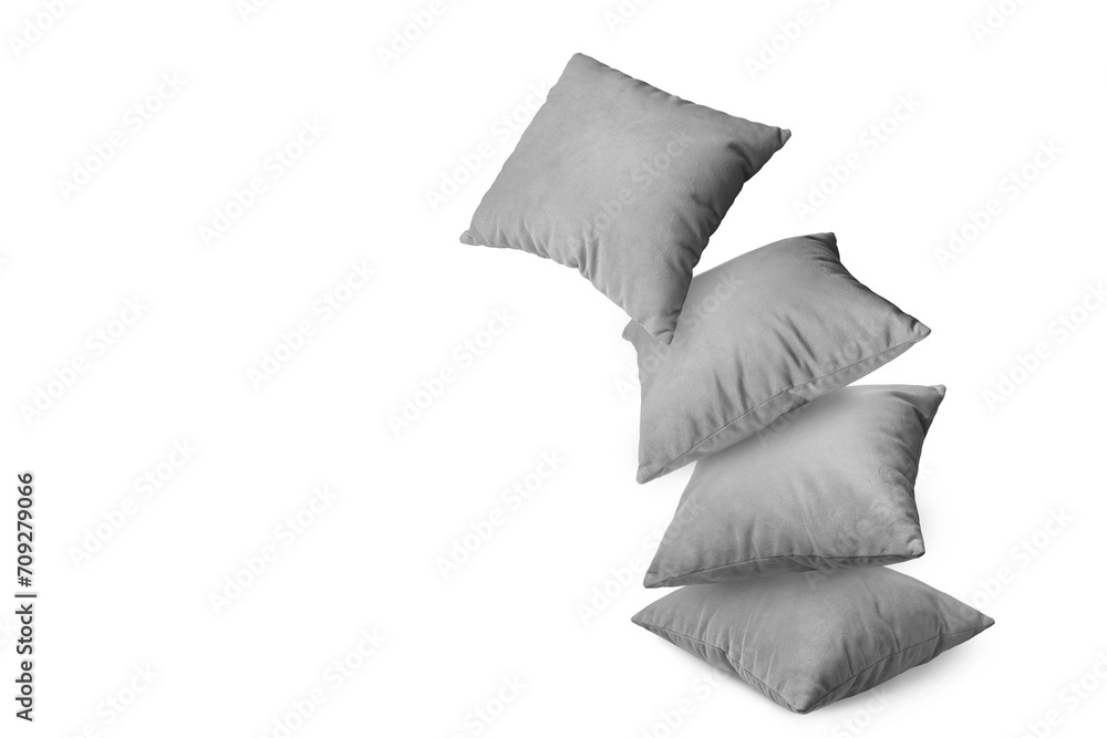Stack of gray pillows isolated on white, transparent background, PNG. Pile of decorative cushions for sleeping and resting, home interior, house decor.