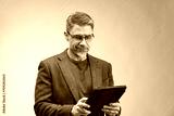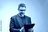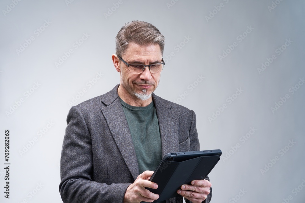 Middle age businessman in business casual using tablet computer. Entrepreneur in jacket. Portrait of mid adult, mature age man, happy smiling. Isolated on white.