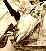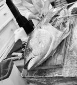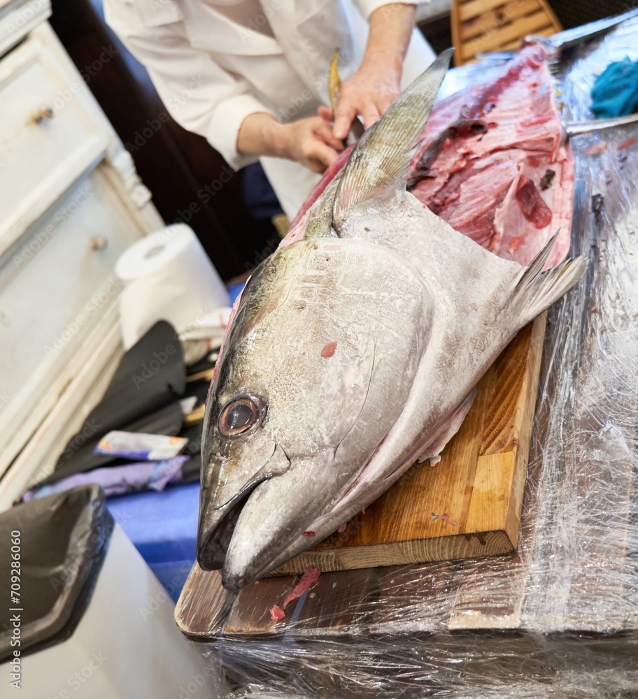 Japanese sushi master chef cutting up and preparing huge fresh tuna fish on kitchen table.