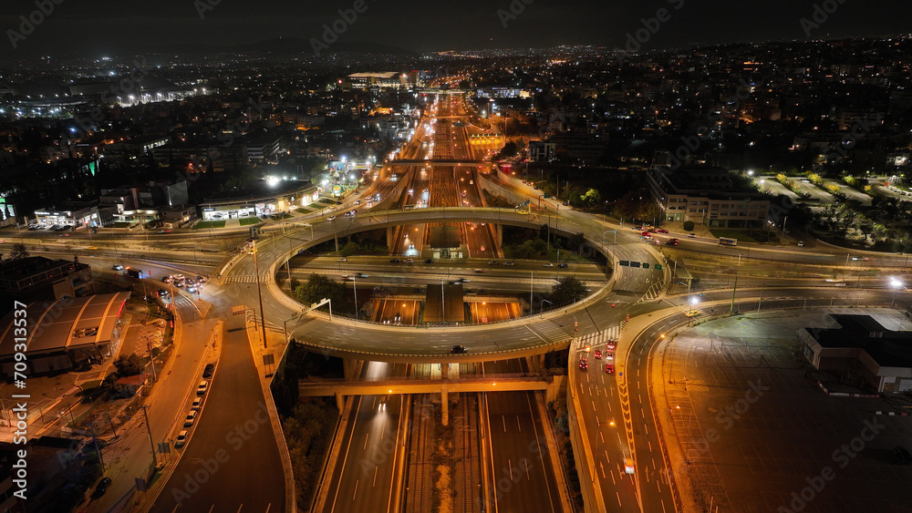Aerial drone slow shutter night photo of illuminated urban elevated toll ring road junction and interchange overpass passing through Kifisias Avenue, Attica, Greece