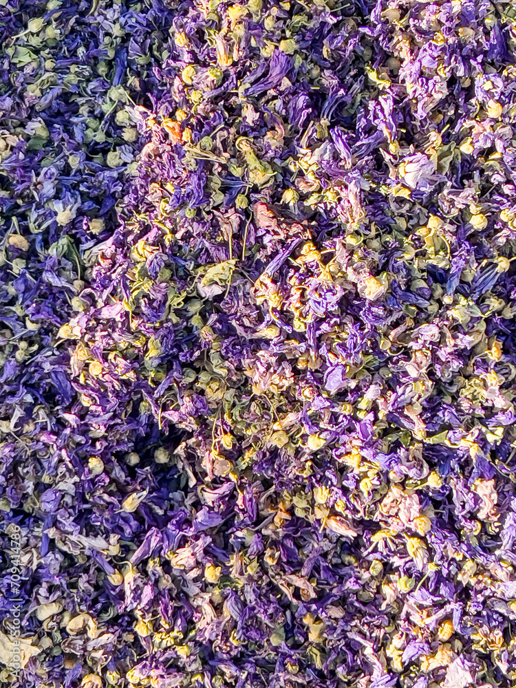 Dried Butterfly Pea Flower, herbal tea texture background, top view, close-up. Organic bio herbs for tea, sun dry Mallow herb buds for sale at market, copy space.Malva sylvestris petals, Prajita Phool