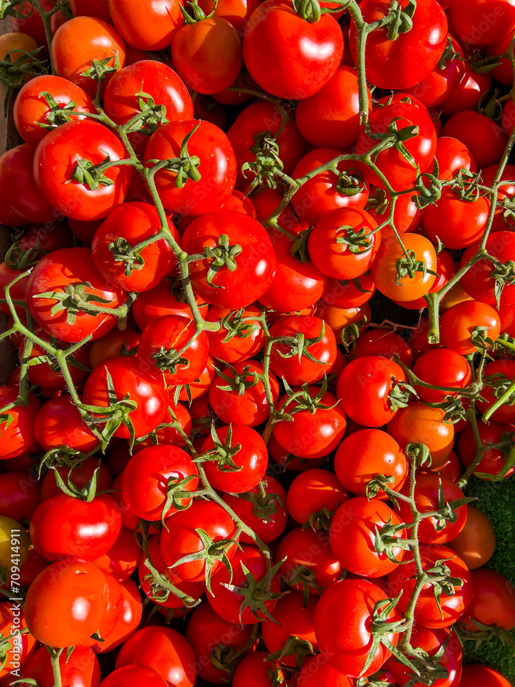 Sun shining on many delicious red tomato branch background with copy space, high angle view, close-up. Summer tray market stall. Agriculture farm full of organic vegetables. Group of fresh tomatoes.