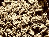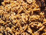 Heap of fresh raw brown walnuts pattern background, copy space in full frame viewed from above. Peeled nuts texture top view