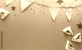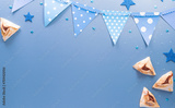 Happy Purim carnival decoration concept made from sparkle star and hamantaschen cookies on pastel background. (Happy Purim in Hebrew, jewish holiday celebrate)