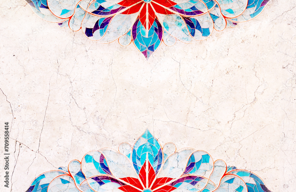 Detail of traditional persian mosaic wall with geometrical and floral ornament, Iran. Horizontal or vertical background with ceramic tile. Mock up template. Copy space for text