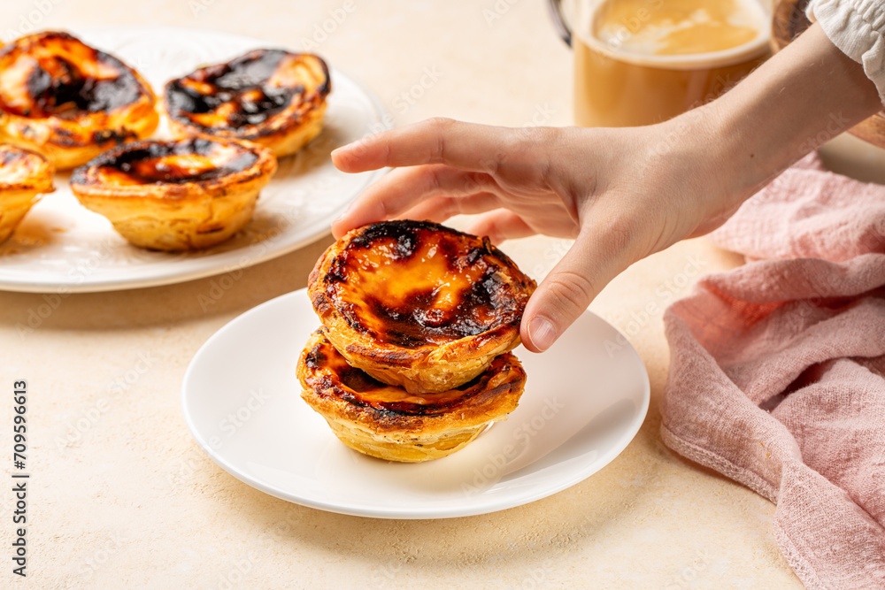 Eating pastel de nata or pastel de Belem, Portuguese baked egg custard tart pastry. Girls hand holding pastry. Sweet breakfast with coffee cup on background.