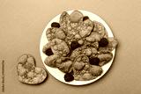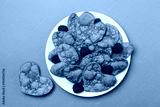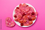 Heart shaped pink sweet cookies, fried angel wings, coloured with beetroot. Valentine day romantic breakfast with raspberries, white background, top view. Bright pink background.