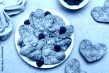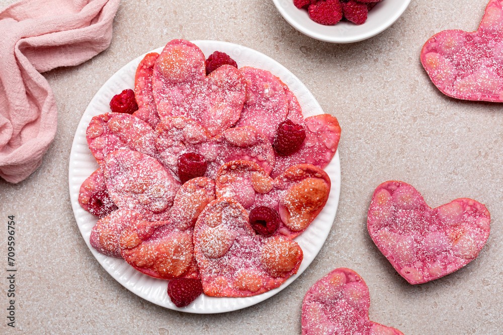 Top view of Heart shaped pink sweet cookies, fried angel wings, coloured with beetroot, powdered with sugar. Romantic breakfast with raspberries, beige background.