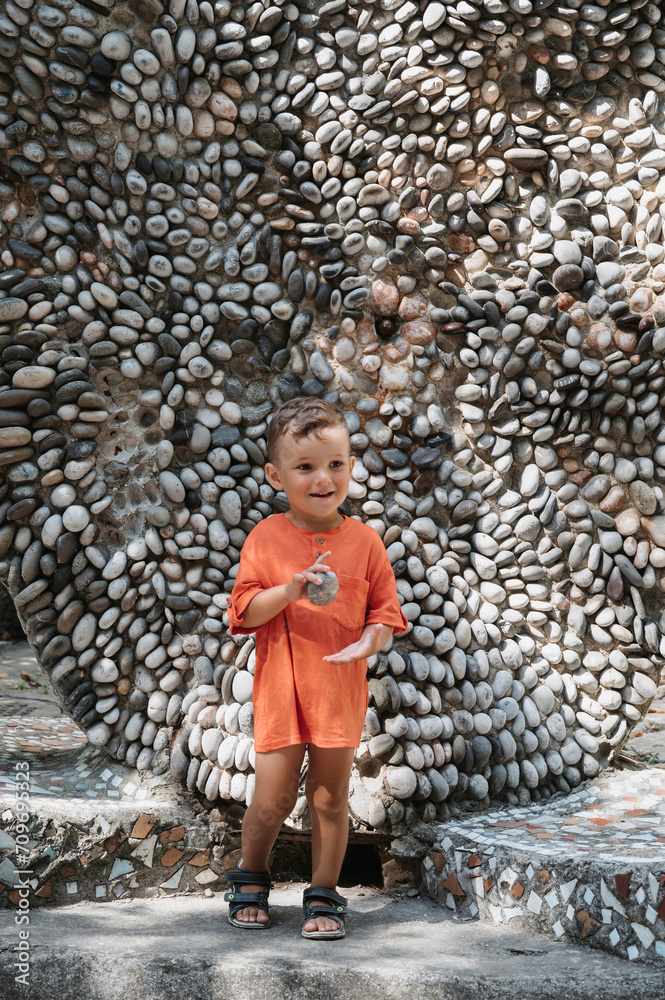 A little boy is walking in the park. A child with his parents explores local attractions, garden figures and sculptures.