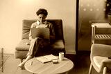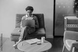 Pretty female freelancer working on laptop while sitting on modern coworking background