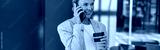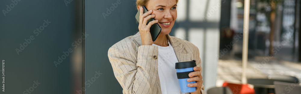 Smiling business woman holding coffee and talking phone standing on modern office background