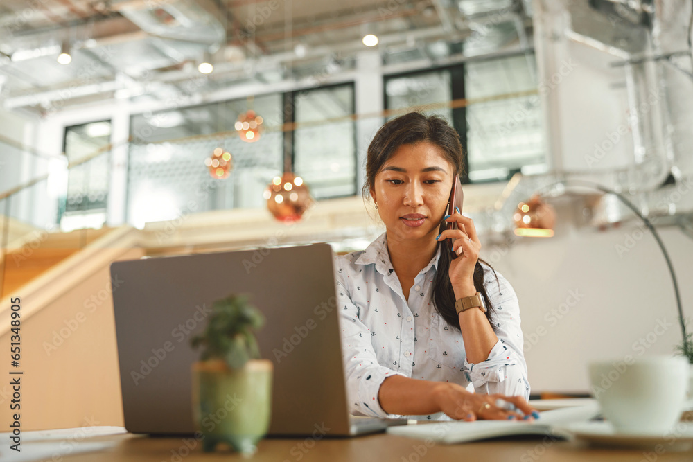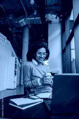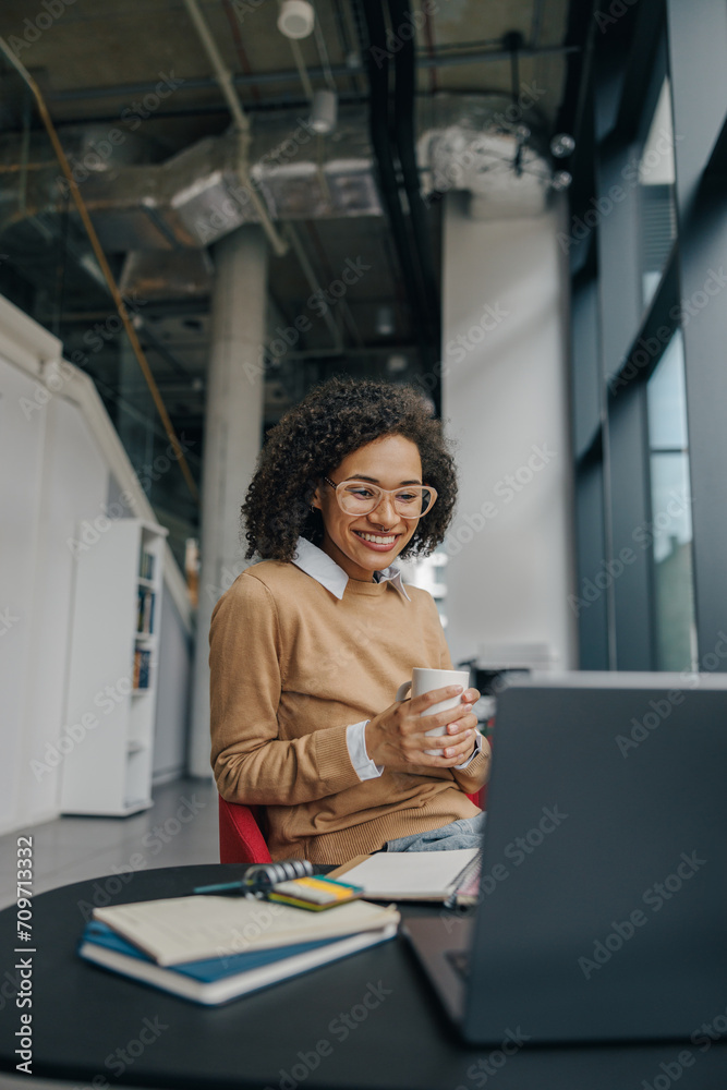 Smiling female freelancer have coffee break during working on laptop in modern coworking