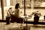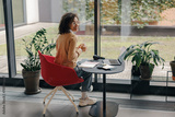 Smiling business woman in eyeglasses have a coffee break during working on laptop in cozy cafe