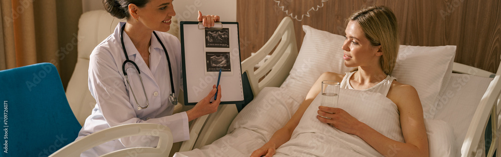 Doctor visiting woman patient in hospital ward to check his health state . High quality photo