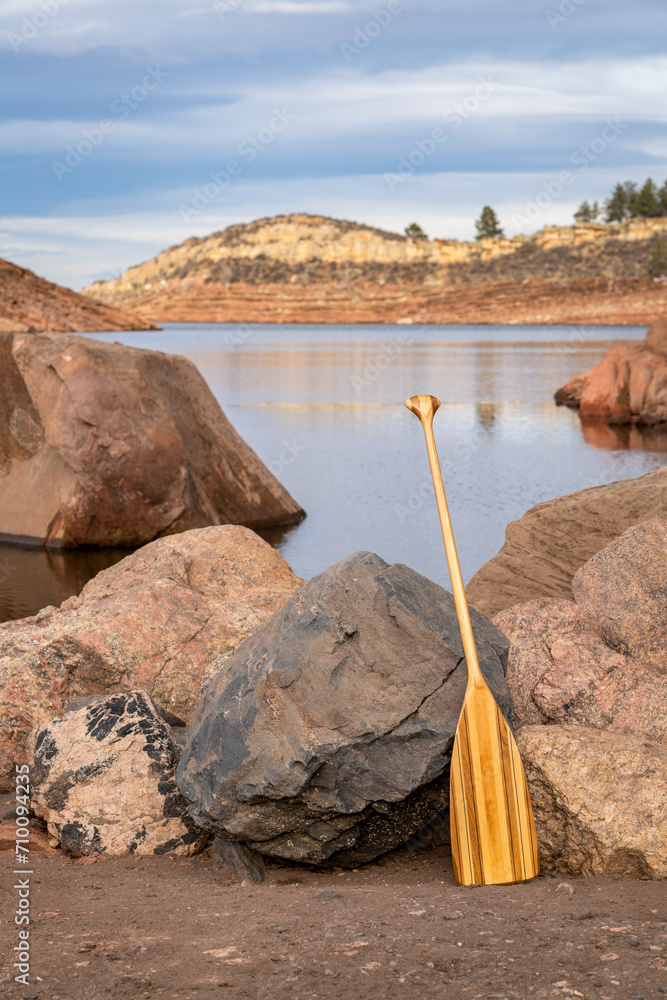 wooden canoe paddle on a rocky shore of a mountain lake - Horsetooth Reservoir in northern Colorado in fall or winter scenery