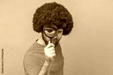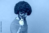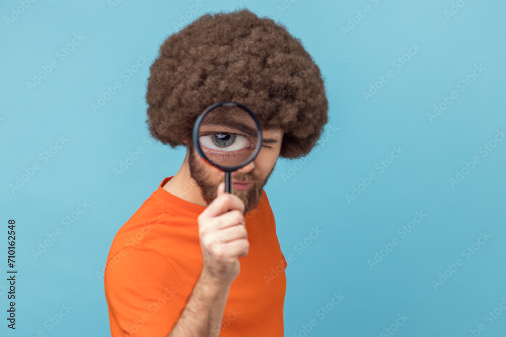 Funny man with Afro hairstyle wearing orange T-shirt standing, holding magnifying glass and looking at camera with big zoom eye and funny expression. Indoor studio shot isolated on blue background.