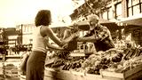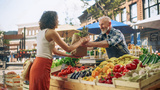 Cheerful Street Vendor Running a Small Farm Market Business, Selling Sustainable Fruits and Vegetables. Happy Middle Aged Man Filling a Recycled Paper Shopping Bag with Local Natural Food