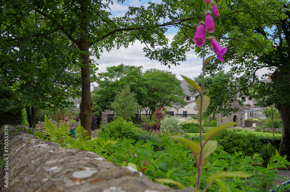 Romantic backstreets with English landscape gardens in bloom in historic old town of Kirkwall, Scotland, a landmark sightseeing tourist spot in downtown Orkney Islands