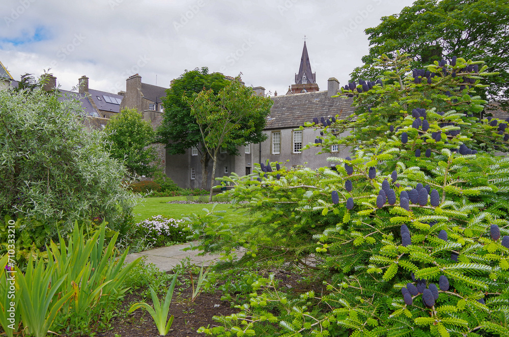 Romantic backstreets with English landscape gardens in bloom in historic old town of Kirkwall, Scotland, a landmark sightseeing tourist spot in downtown Orkney Islands