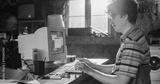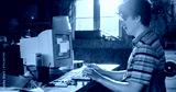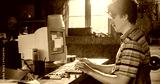 Caucasian Male Hardware Engineer Programming On Old Desktop Computer In Retro Garage. Experienced Software Developer Writing Code For New Innovative Operating System In Nineties.