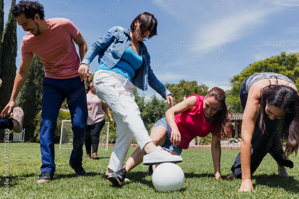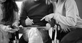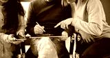 Employees point to tablet screen while discussing hot topics. Receiving information from electronic devices concept