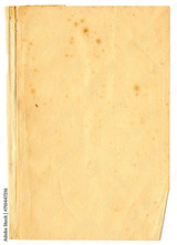 Alte vergilbte Buchseite Knick Stockflecken - Samtmilbe Milbe Laus als kleines rotes Tierchen links mittig im Bild