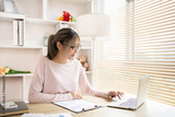 Young woman using a laptop, Work from the comfort of home, Use your laptop for work and communication, Work from home.