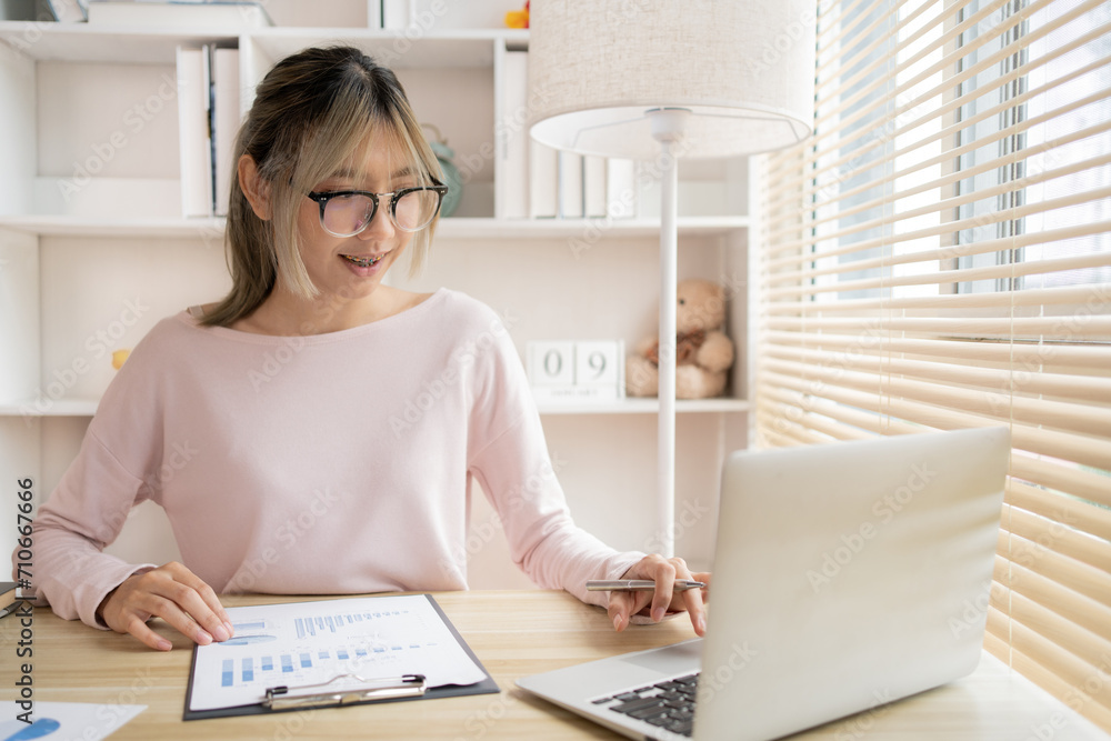 Young woman using a laptop, Work from the comfort of home, Use your laptop for work and communication, Work from home.