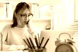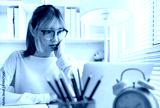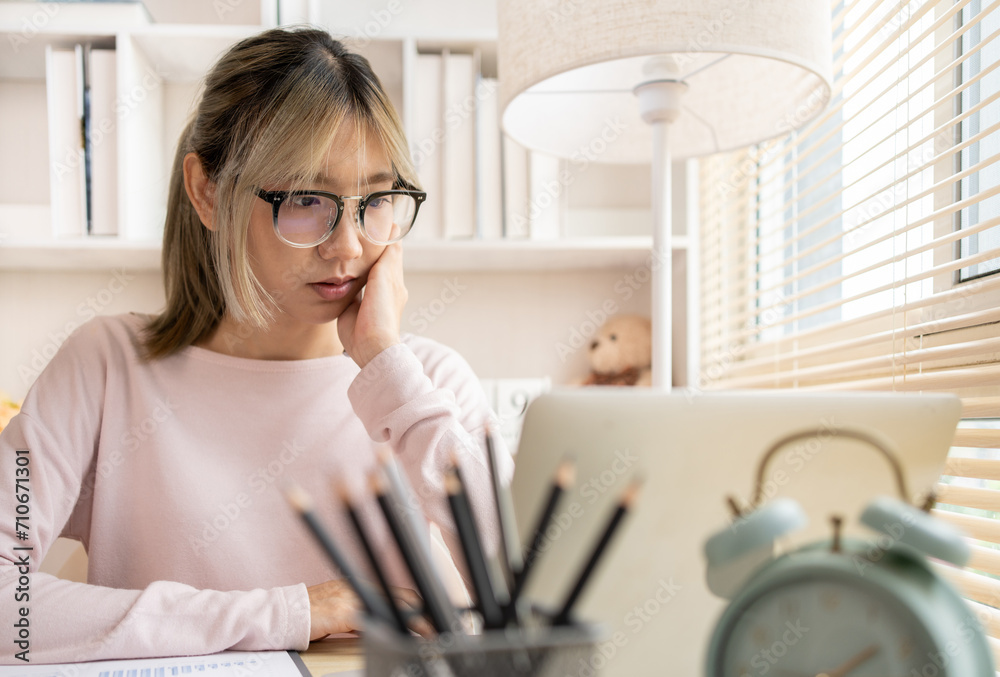 Young woman sitting at computer desk working, Analyzes data graphs on laptop, Works intently in his personal office, Work from home.