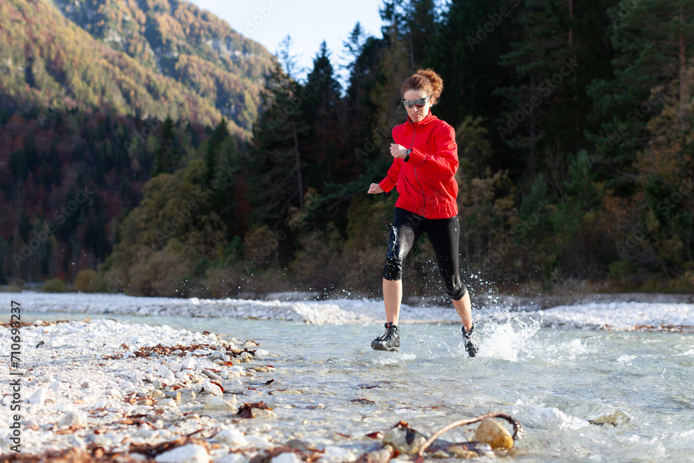 Carefree Confident Young Adult Woman Running Splashing over Mountain Water Stream Enjoying Nature Wilderness Freedom