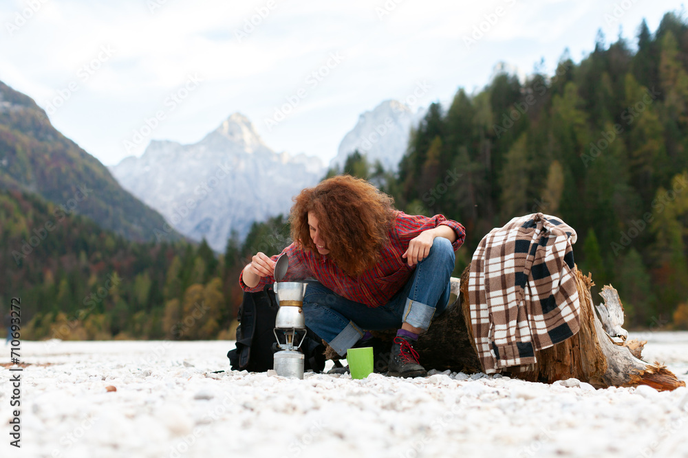Mid Adult Woman Hiker Enjoying a Pause on a Hike with a Coffee Cup prepared at Location before continuing the Discovery Journey in Nature