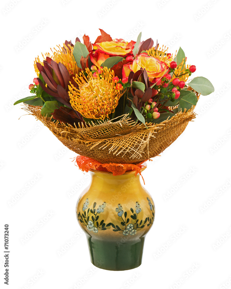 Bouquet from Roses and Arabian Star Flower in Vase Isolated.