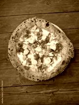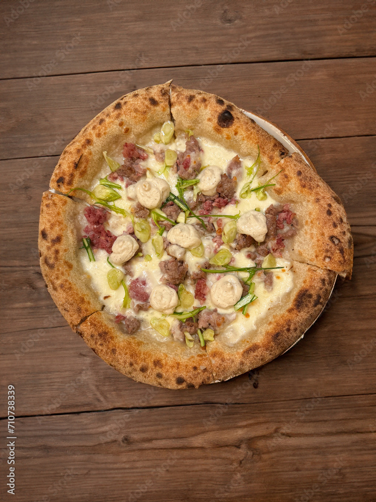 Neapolitan pizza with high edges 4 cheeses and fresh sausage top view on white plate.