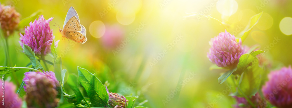 Sunny spring or summer nature background with fly butterfly and wild clover flowers in grass with sunlight and bokeh. Outdoor nature