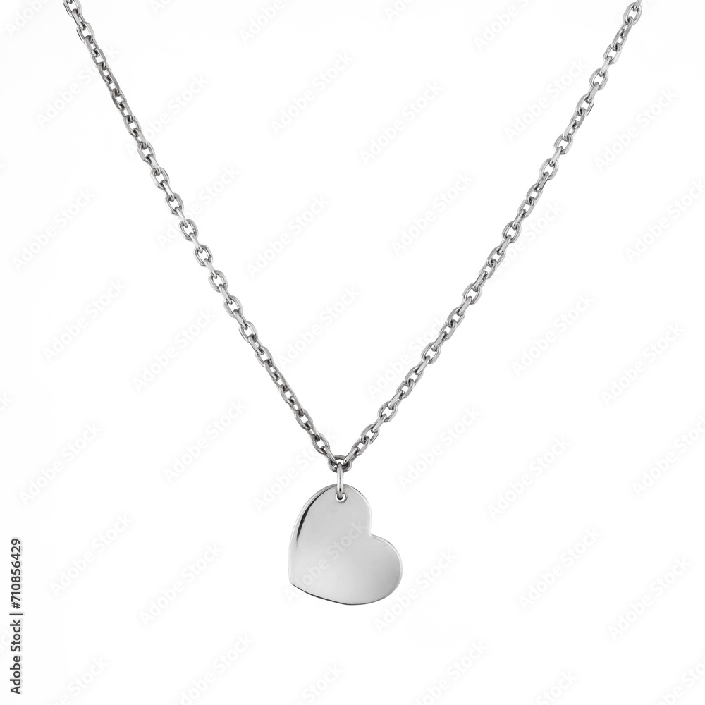 Female heart shaped pendant with silver chain necklace isolated on white background
