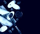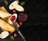 Baguette and homemade raspberry jam on the black wooden background. Top view. Copy space.