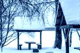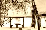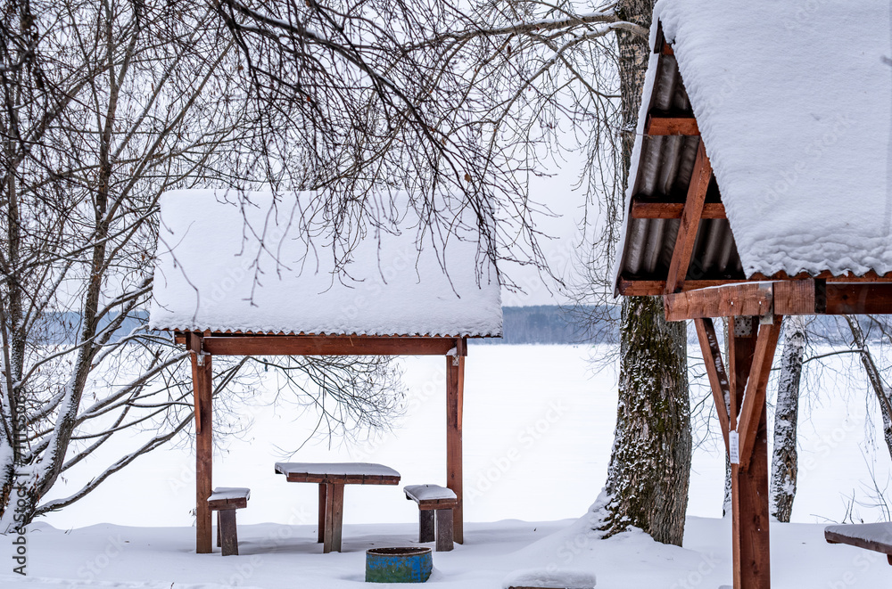 Gazebo for relaxing under the snow in winter on the shore of a frozen lake.