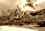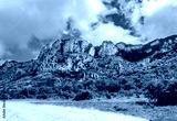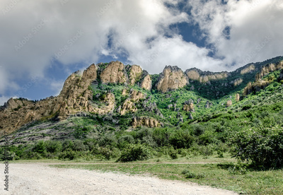 Cliffs covered with forest against the sky in summer.
